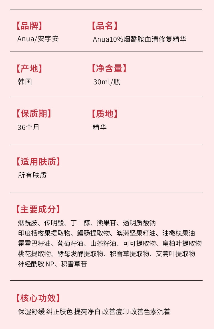 [Double 11 Snap-up] Anua10% Nicotinamide Serum Essence Tranexamic Acid Brightening and Hydrating Moisturizing South Korea